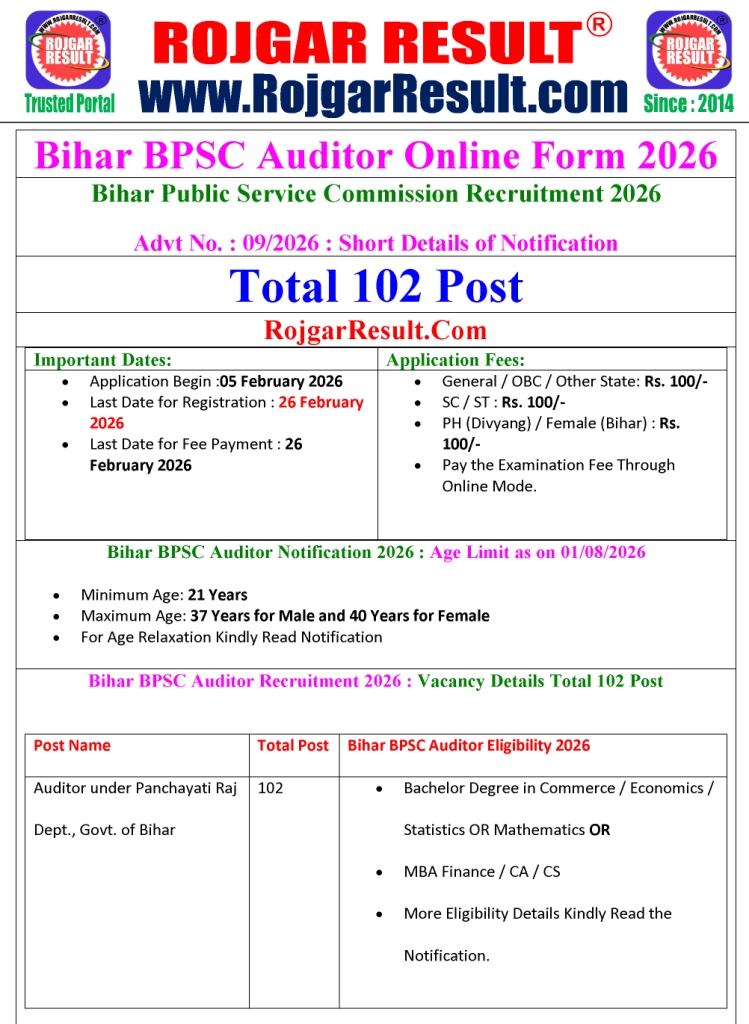 Short Information: The Bihar Public Service Commission has released the official notification for Bihar BPSC Auditor Recruitment 2026. Eligible candidates can apply online for Auditor posts through the official application form. The online application process has commenced from 05 February 2026 and will remain open till 26 February 2026. Applicants can check complete information regarding age limit, educational qualification, total vacancies, selection process, syllabus, exam pattern, and other important instructions in the official notification. The direct link to apply online and download the notification is available on the official website as well as visit on RojgarResult.blog (ResultBharat, SarkariNaukri). government job portal, sarkari naukri portal, job portal india, employment news portal, recruitment portal india, exam portal india, career portal india