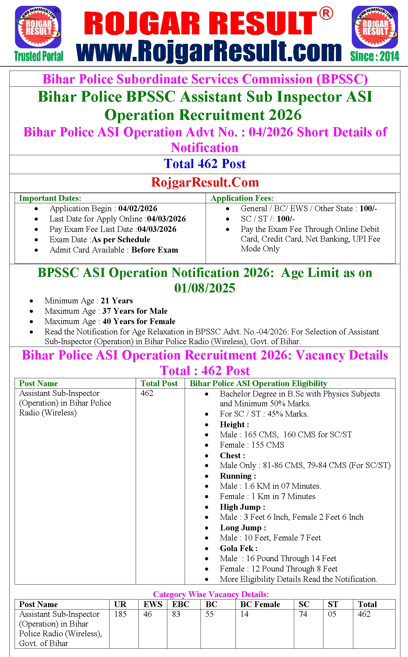 Bihar Police Subordinate Services CommissionBPSSC ASI Operation Recruitment 2026Advertisement No. 04/2026Â |Â Total : 462 PostsWWW.ROJGARRESULT.BLOG |